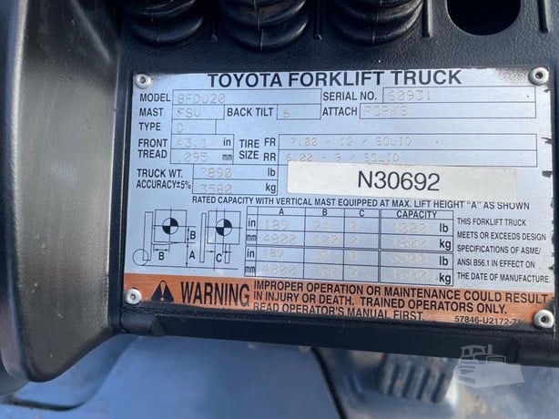 Manufacturer TOYOTA Model 8FDU20 Serial Number 60931 Condition Used Description 4000# Capacity 16′ Triple Stage Mast DIESEL Engine Side-Shift CAN BE ADDED FOR $795 Auto Trans BRAND NEW Pneumatic Tires Runs Great